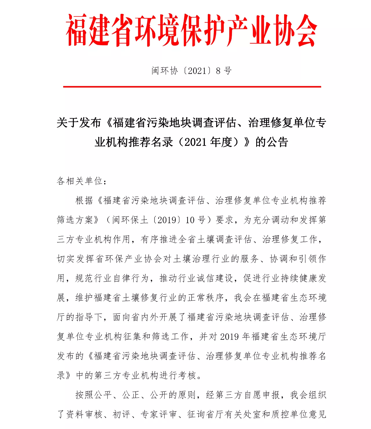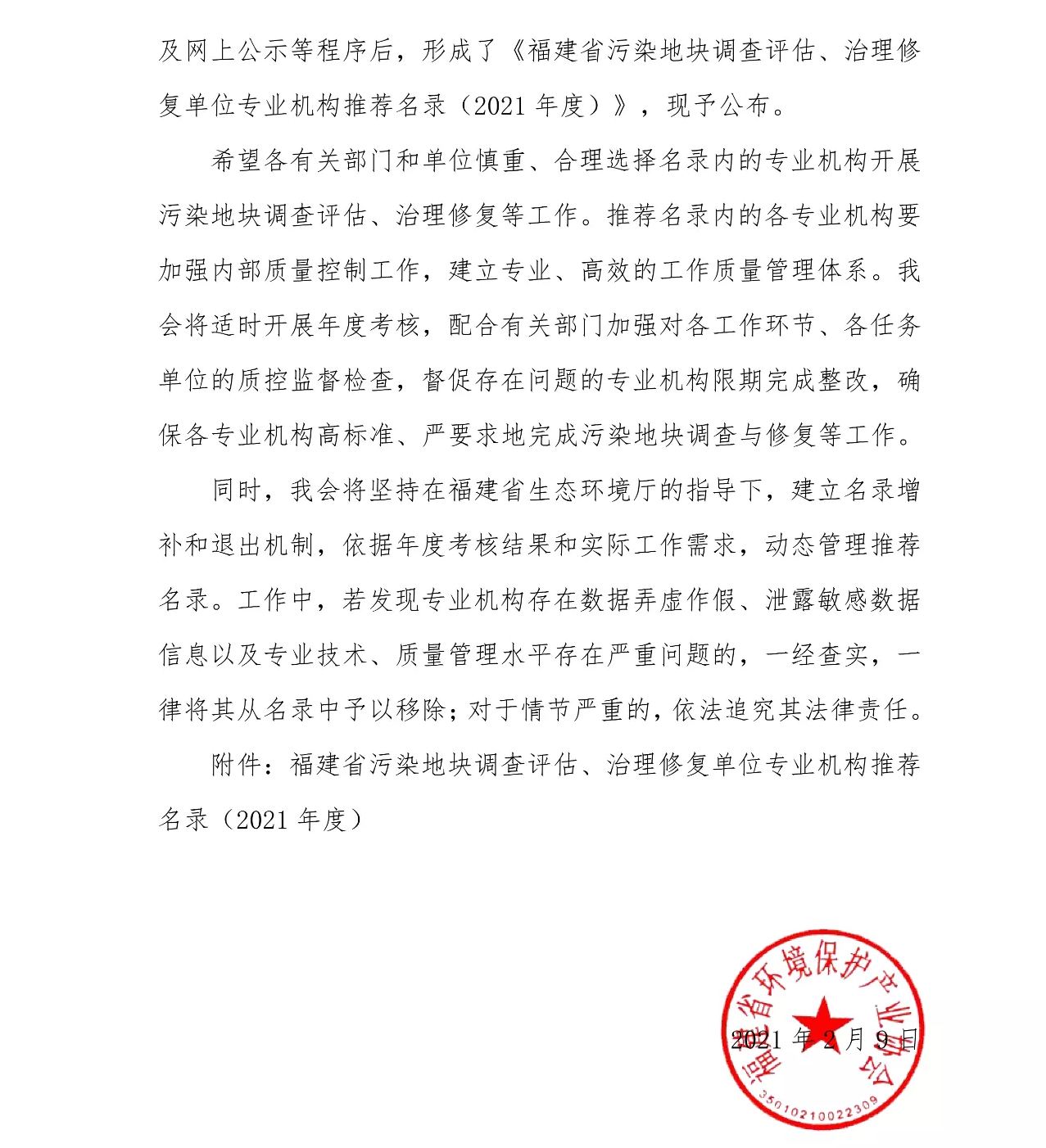 中凱檢測入選《福建省污染地塊調(diào)查評估、治理修復(fù)單位專業(yè)機(jī)構(gòu)推薦名錄(2021年度)》