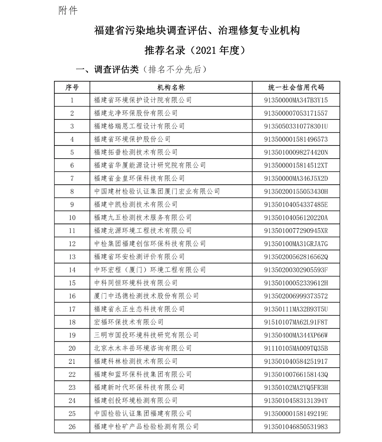 日前,《福建省污染地塊調(diào)查評估、治理修復(fù)單位專業(yè)機(jī)構(gòu)推薦名錄(2021年度)》已經(jīng)發(fā)布。中凱檢測成功入選調(diào)查評估、方案編制等類目推薦機(jī)構(gòu)。