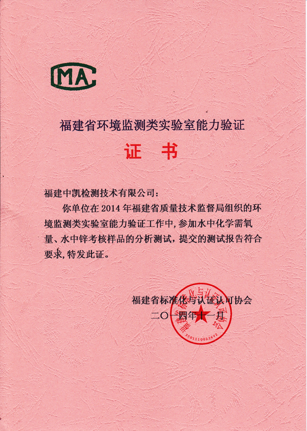 根據(jù)福建省質(zhì)量技術(shù)監(jiān)督局《關(guān)于下達2014年福建省實驗室能力驗證計劃的通知》,福建中凱檢測技術(shù)有限公司于2014年9月參加由福建省質(zhì)量技術(shù)監(jiān)督局組織能力驗證。