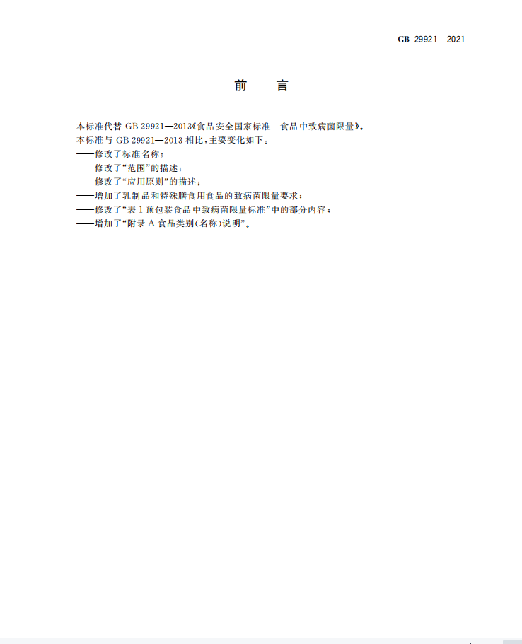 2021版標(biāo)準(zhǔn)由《食品安全國家標(biāo)準(zhǔn) 食品中致病菌限量》修改為 《食品安全國家標(biāo)準(zhǔn)?預(yù)包裝食品中致病菌限量》