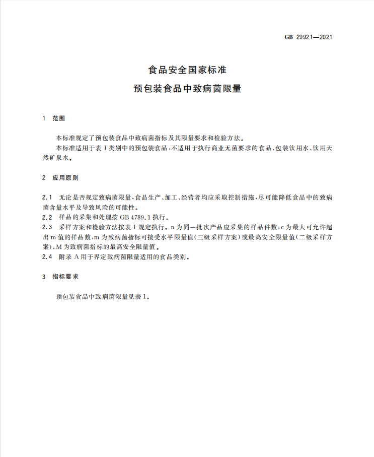GB 29921屬于通用標(biāo)準(zhǔn),適用于預(yù)包裝食品。其他相關(guān)規(guī)定與本標(biāo)準(zhǔn)不一致的,應(yīng)當(dāng)按照本標(biāo)準(zhǔn)執(zhí)行。其他食品標(biāo)準(zhǔn)中如有致病菌限量要求,應(yīng)當(dāng)引用本標(biāo)準(zhǔn)規(guī)定或者與本標(biāo)準(zhǔn)保持一致。